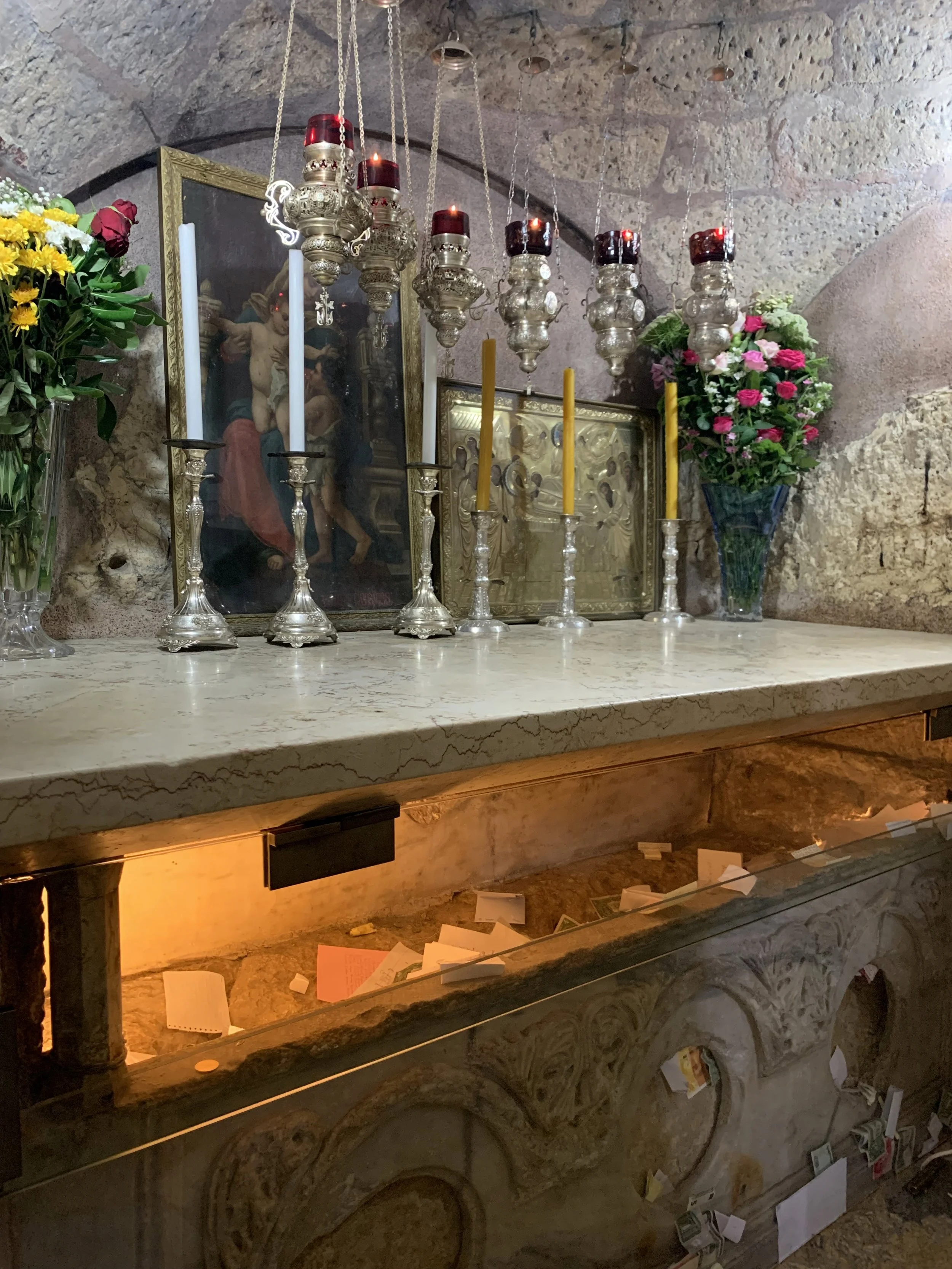 They process with candles down the long crusader staircase to her Tomb where they venerate this holy site. Behind the Tomb of Mary they place an icon of Mary on a table draped with a beautiful cloth. Each person gets down on their hands and knees, like a little child and crawls under the table, under the Mantle of Mary, rises on the other side and kisses the cheek of Our Lady.